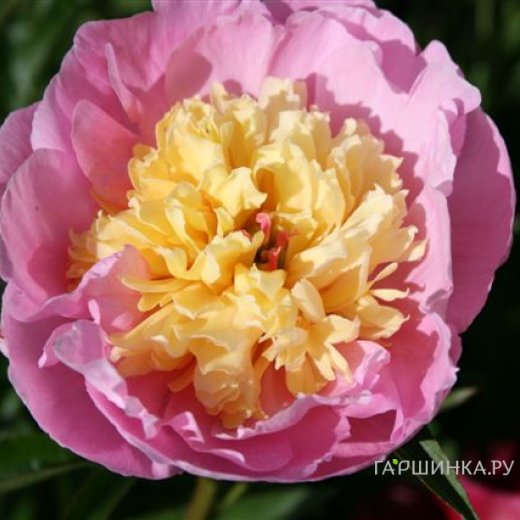 Цветок полумахровый, нежно-розового цвета с желто-кремовым кольцом тычинок. Диаметр до 18 см. Листва темно-зеленая.