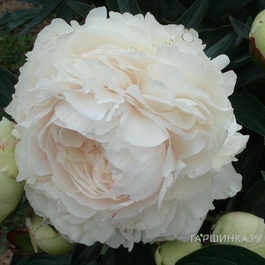 Пион Соланж (Paeonia Solange)- Густомахровый, очень красивой формы. Кремово-белый. Куст раскидистый густооблиственный, стебли толстые, слегка изгибаются под тяжестью цветка, применяются опоры.