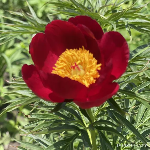 Пион уклоняющийся (Марьин корень) - тонколистная разновидность, высота 0,5 м, рост быстрый, форма округлая. Окраска полумахрового шелковистого цветка ярко-красная, 10 см, тычинки короткие, перламутровые, желтые, лист узкий темно-зеленый, полуглянцевый. Присутствует сильный аромат, по сроку цветения - средне-ранний. Зона зимостойкости 4.