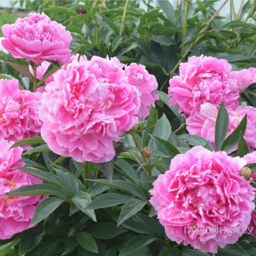 Пион Якорма - Махровый. Цветок насыщенно-розовый, хорошей формы. Листва серо-зелёная. Высота 85 см. Стебли сильные. Срок цветения поздний.