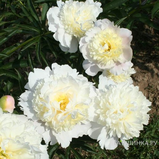 Пион Золотой Ореол белый - махровый шаровидный. Цветок 17х11 см, вначале светло-жёлтый, в полном роспуске розоватый. Цветение обильное, в поздние сроки. Высота 80 см. Растёт быстро.