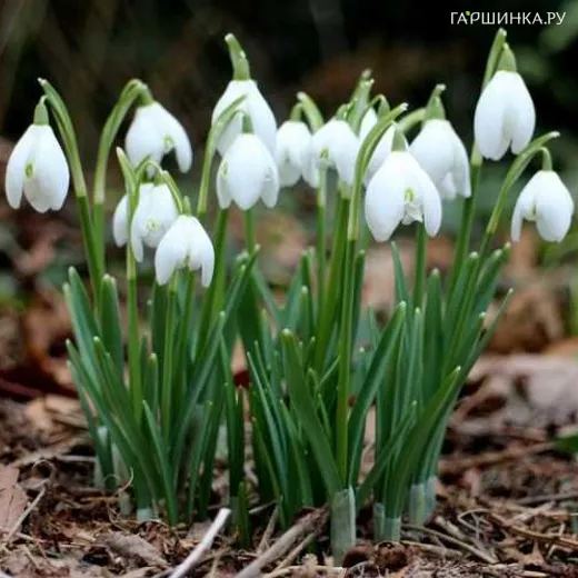 Подснежник (галантус) простой 5шт - многолетнее растение высотой до 20 см, с полосатыми глянцевыми темно-зелеными листьями и безлистными стеблями, имеющими до 8 колоколообразных белых цветов шириной 2 см, каждый сегмент лепетка оканчивается зеленым. Аромат легкий.