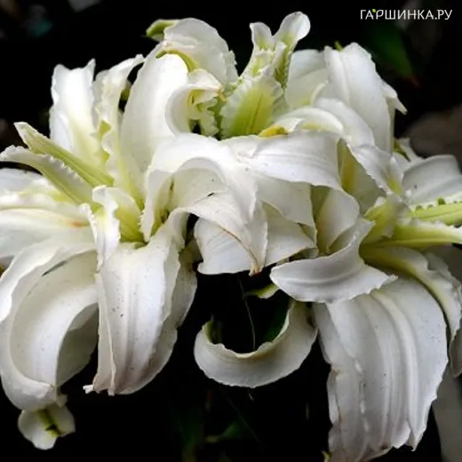Лилия Полар Стар восточная махровая Период цветения приходится с июля по август, образуя роскошные пышные цветы с нежным сладким ароматом диаметром 15-20 см белоснежного оттенка с нежно-желтым цветом в основании слегка волнистых лепестков. Лепестки нежные трехслойные, слегка закручены, благодаря чему цветок принимает привлекательную и пышную форму. Продолжительность цветения 2-4 недели. Высота растения 100 см. Зимостойкий сорт.