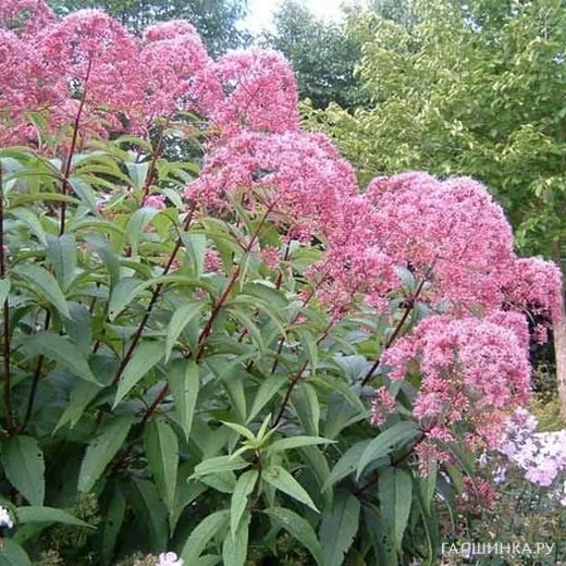 Посконник Атропурпуреум - высокорослый многолетник с крупными розово-фиолетовыми соцветиями. Прямостоячие стебли высотой до 200 см окрашены в темно-красный цвет. Листья мутовчатые, удлиненные. Мелкие трубчатые цветки розово-фиолетового цвета собраны в корзинки, которые в свою очередь образуют щитковидные или метельчатые соцветия диаметром до 30 см. Зацветает посконник пурпурный в начале августа, цветет до конца сентября.