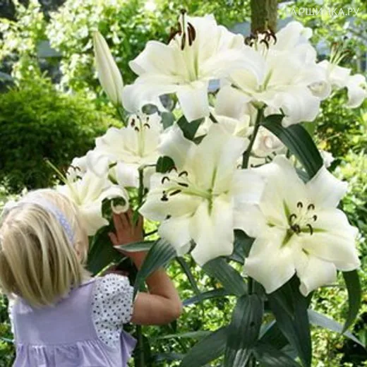 Лилия Претти Вумен ОТ-гибрид - Образует крупные (до 40 см в диаметре) белые душистые цветки с завернутыми вниз лепестками. Высота растения от 130 до 150 см. Цветет лилия в июле-августе.