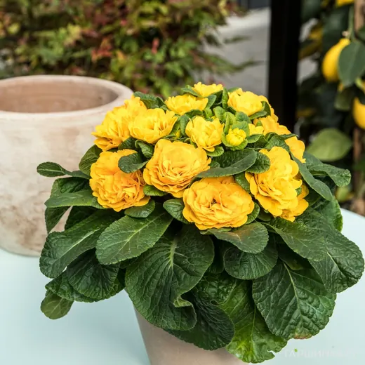Примула Беларина Спринг Сан - неприхотлива, хорошо разрастается, предпочитает влажные богатые гумусом почвы. Листья небольшие, овальные, морщинистые, собраны в розетку. Цветоносы растут из центра розетки. Цветки крупные, до 5 см в диаметре, махровые, очень привлекательные. Цветение с конца апреля до середины мая, при благоприятных условиях возможно повторное цветение осенью.