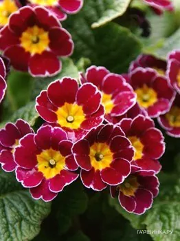 Примула Gold Lace Scaret NEW! – многолетнее травянистое растение. Высота примулы без цветоносов 15 см, с цветоносами 40-45 см. Цветки мелкие, высококонтрастные: лепестки округлые, сочно-красного цвета, обрамленные золотисто-желтыми фестонами, имеют яркий желтый центр. Цветет апрель-май.