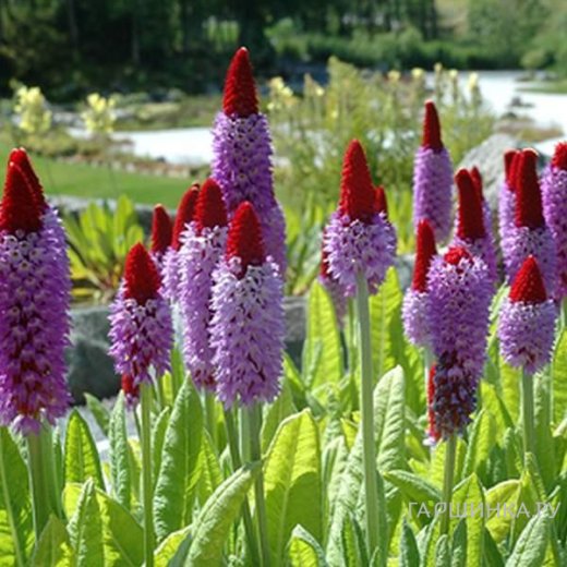 Примула Виаля – многолетнее травянистое растение. Высота куста 20 см. Розетка ланцетовидных листьев, длиной 30 см и шириной 7 см. Соцветие — колос длиной до 18 см. Цветет в июне 3-4 недели. Еще до распускания цветков растение очень привлекательно. Эту привлекательность создают чашечки, в которых спрятаны цветки. Они окрашены в алый цвет. Когда наступает пора цветения, из ярких чашечек начинают появляться нежные лиловато-голубые колокольчики. Зимуют эти растения в холодном климате только с укрытием.