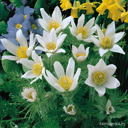 Прострел Альба - эффектный шелковисто-опушенный первоцвет с крупными колокольчатыми белыми цветками с многочисленными желтыми пыльниками. Высота растения 25см. Серебристо-белые листья прикорневой розетки имеют длинные черешки, неправильно глубоко рассечены. Молодые листья также сильно опушены. Цветет с апреля по май.