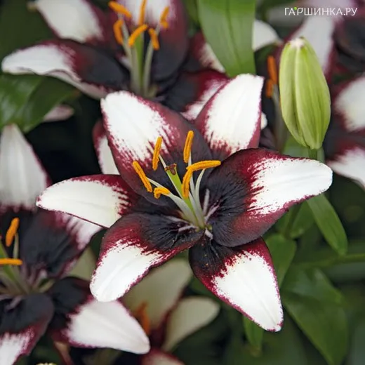 Лилия Пурпл Харт азиатская/2шn - цветы белоснежного оттенка с темно-бордовым оттенком у основания. По краям нежных лепестков лилии есть тонкая бордовая кайма. Высота растения 120 см. Цветки лилии 15 см в диаметре. Нежный аромат. Период цветения июнь-июль.