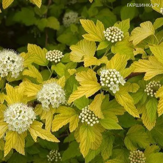 Пузыреплодник Дартс Голд - Среди большого количества декоративных растений только некоторые могут похвастаться абсолютной неприхотливостью и высокой декоративностью. К таким растениям относится и пузыреплодник калинолистный. Выращивают это растение из-за его эффектного вида: шаровидная густая крона из раскидистых поникающих ветвей с крупными гофрированными листьями выглядит пышно сверху донизу. Пузыреплодник калинолистный Dart's Gold вырастает до 1,5 м, листья при распускании оранжево-желтого цвета, летом немного зеленеют, а осенью желто-бронзового оттенка. Весной на нем появляются кисти белых или слегка розоватых цветков. По сути, этот сорт является усовершенствованной формой luteus, так как имеет значительно более яркую желтую листву и сохраняет этот привлекательный цвет весь летний сезон.
