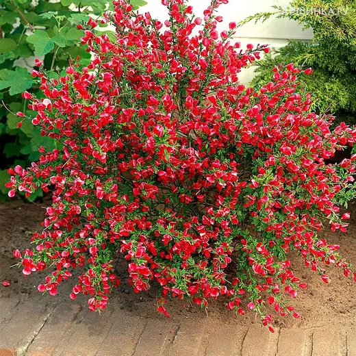 Ракитник Боскоп Руби - представляет собой шарообразный обильноцветущий кустарник из семейства Бобовые. Этот вид отличается высокой декоративностью и является одним из самых ярких и фееричных растений, высаженных на садовом участке. Куст ракитника Боскоп Руби густой, плотный, сформирован из множества тонких стеблей с гладкой корой. Прутьевидные побеги, растущие от центра и смотрящие во все стороны, изящно изгибаются вниз под тяжестью многочисленных цветов. Так они образуют практически идеальный по форме шар. Куст довольно быстро разрастается, давая годовой прирост от 20 до 40 см, без стрижки достигая в ширину и высоту порядка 2 м. На малоразветвленных стеблях ракитника растут чередующиеся мелкие трехпалые листья. Ярко-зеленая листовая пластина продолговато-ланцетовидная, длиной – до 2 см. Плодами являются плоские многосемянные (два и более) стручки с бобами, которые, вызревая к осени, свободно рассеиваются по поверхности грунта вокруг куста. Ракитник Боскоп Руби отличается хорошей засухоустойчивостью, нетребовательностью к составу почвы.Своей декоративности ракитник Боскоп Руби обязан густо расположенным вдоль побегов многочисленным цветам насыщенного рубинового оттенка, который переходят ближе к середине в лиловый. Цветоножка, а также чашечка опушены. Соцветия довольно крупные, размером – до 2.5 см, по своей форме схожи с цветами гороха.