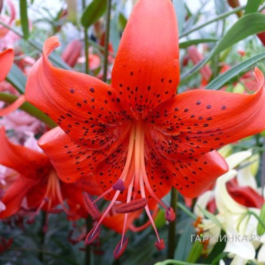 Лилия Ред Лайф тигровая Высота растения 100-140 см, цветки оранжево-алые, с тёмным крапом, чалмовидные, направлены в стороны и вниз. Зацветает в июле.