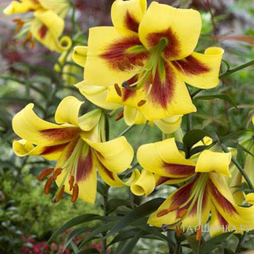 Лилия Роберт Свонсон ОТ-гибрид - Образует крупные, до 30 см в диаметре, цветки. Окраска лимонно-желтого оттенка, а к центру переходит в рубиновое пятно. Лепестки атласные, сильно закручены. Цветение длительное, сопровождается сладким ароматом. Высота растения от 130 до 150 см. Цветет лилия в июле-августе.