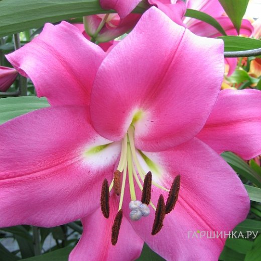Лилия Робина ОТ-гибрид темно-розовая - лилия с огромными, шелковистыми цветами теплого, малинового цвета и небольшим белым центром. Запах довольно сильный. Высота растения до 100 см, диаметр 20 см. Цветение - конец июля.