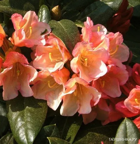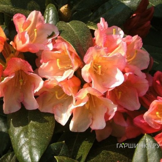 Рододендрон гибридный Ауреолин - Густой, вечнозелёный, обильноцветущий кустарник. Цветки от вишнево-золотых до светло-желтых - экстравагантная феерия красок в течение нескольких недель! Листья крупные, эллиптические, темно-зеленые, кожистые. Высота: 120 см. Цветение: май-июнь. Вечнозеленые сорта рододендрона получены селекционным путем и поэтому их еще называют гибридными. Гибридный рододендрон очень популярен и славится своими декоративными качествами и морозостойкостью. Отличается длинными кожистыми листьями, большими цветами, почти всех возможных оттенков, в зависимости от сорта.
