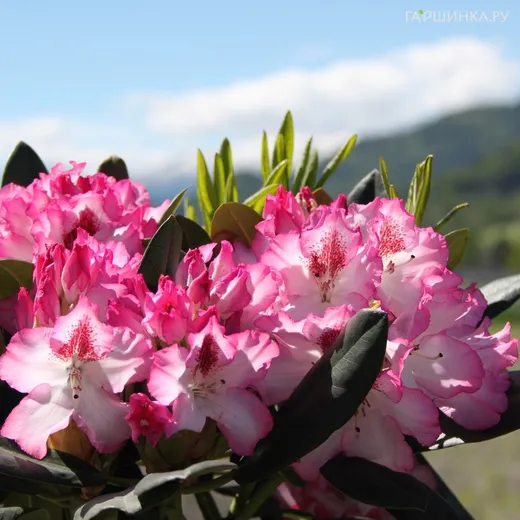 Рододендрон Хахманс Шарман Вечнозеленый гибридный сорт. К 10 годам вырастает до 1,5 м, взрослое растение может вырастать до 3 м. Крона округлая, раскидистая. Листья плотные, матовые, темно-зеленые. Цветение в мае-июне, обильное, основной тон цветков светло-розовый, окантовка лепестков — ярко-бордовая. Такого же цвета пятно украшает крупный центральный лепесток.