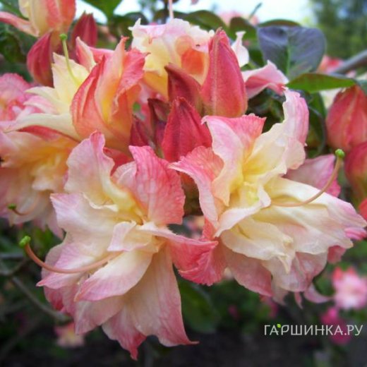 Рододендрон (Азалия) Кэннонс Дабл - Листопадный кустарник с прямой и широкой кроной. Цветки трубчатые махровые многоцветные, с оттенками жёлтого, кремового и розового, бутоны красноватые, в куполообразных соцветиях по 7-8 цветков. Листья узко-обратнояйцевидные до обратно-ланцетные, плоские с клиновидным основанием до 10 см длиной, матово-зеленые. Высота взрослого растения: 1,2 м. Время цветения: июнь. Предпочитает легкую полутень, требует укрытия на зиму.