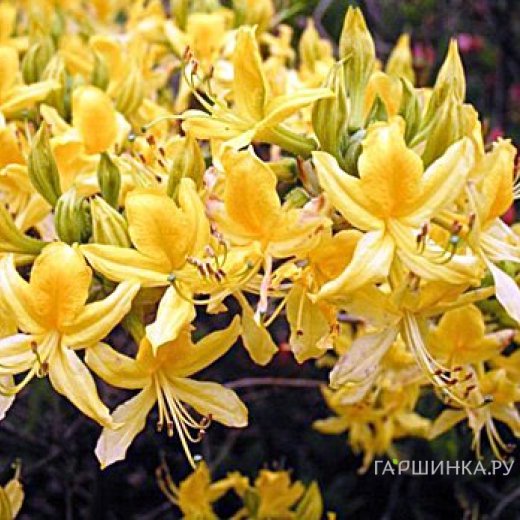 Рододендрон (Азалия) Narcissiflora Р9 - декоративный, листопадный, мелколистный, мелкоцветковый, густой кустарник. Куст прямостоячий, низкорослый1,2 м, густой, широко распростертый, формируется легко, крона подушкообразная. Побеги покрыты черными чешуйками, короткие. Лист мелкий, широкоэллиптический, чешуйчатый со всех сторон. Цветок 5-7 см, ярко-желтый, повторноцветущий сорт. Цветение продолжительное , обильное, ежегодное.