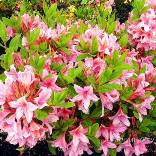 Рододендрон (Азалия) Soir de Paris - декоративный, листопадный, мелколистный, мелкоцветковый, густой кустарник. Куст прямостоячий, низкорослый1,2 м, густой, широко распростертый, формируется легко, крона подушкообразная. Побеги покрыты черными чешуйками, короткие. Лист мелкий, широкоэллиптический, чешуйчатый со всех сторон. Цветок 5-7 см, розовый, повторноцветущий сорт. Цветение продолжительное , обильное, ежегодное.