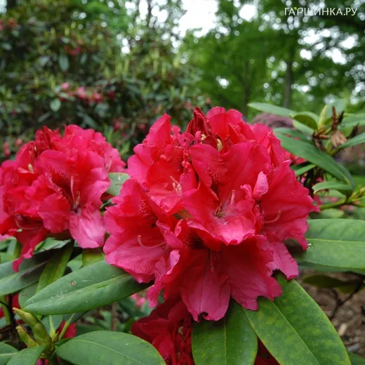 Рододендрон Марианна Фон Вайцзеккер - Вечнозелёный плотный кустарник высотой до 1,5 метров, с красивой формой кроны, ширина 0,8-1,0 м. Отличается красивым, обильным и продолжительным цветением. Соцветия до 14 см в диаметре, состоящее из 15 – 20 цветков. Цветки крупные, внешняя сторона лепестков красная, внутренняя – малиновая. Цветение – в июне, продолжительность цветения: 2-3 недели. Предпочитает кислые почвы, богатые перегноем, хорошо дренированные. Предпочтительна полутень. Морозостойкость до -25С. Рекомендуется лёгкое укрытие на зиму, для защиты от давления снега.