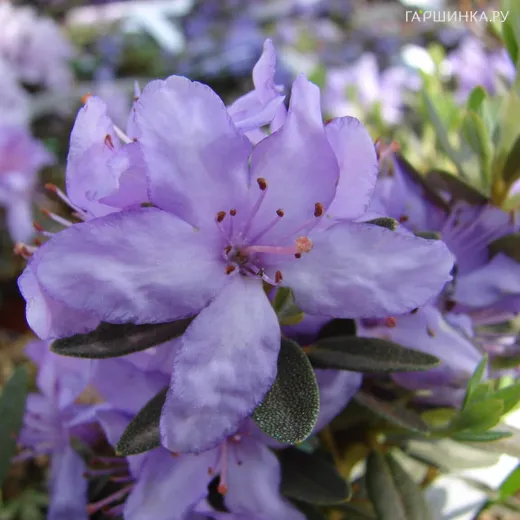 Рододендрон гибридный плотный - низкорослый, неприхотливый, вечнозеленый кустарник. Куст прямостоячий, форма подушковидная, 0,4 м. Лист яйцевидно-эллиптический, мелкий, плотный, серо-голубой, позже зелено-серый. Цветки ширококолокольчатые, мелкие, 2.8 см, бледно-фиолетовые, лилово-розовые.