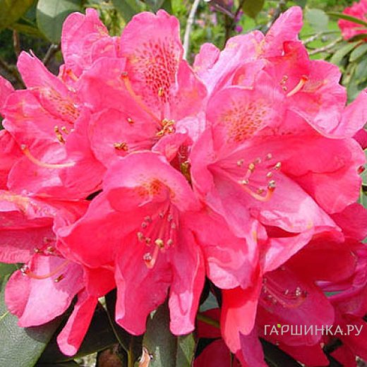 Рододендрон Souvenir of A. Waterer - Высота взрослого растения 180 см. Цветы и листья крупные. Является одним из самых выносливых рододендронов. Цветки красно-розовые, центральный лепесток с желтым пятнышком с мелкой крапинкой. Цветение с мая. Листва очень тёмная. Цветки крупные. Вечнозелёное растение, морозоустойчиво.