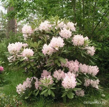Рододендрон гибридный Ст. Мишель - Самый выносливый из финских вечнозелёных рододендронов, в котором сочетаются великолепный внешний вид и прекрасная выносливость. Кусты высотой 150-200 см и шириной 120 см, плотные, компактные, густоветвистые. Листья плотные, обратноланцетные, с острыми вершинами и округлым основанием, край листа слегка волнистый, блестящие, тёмно-зеленые, с нижней части опушённые. Примерный размер листьев 175 × 65 мм. Молодые листья покрыты белым войлочным опушением. Соцветия расположены на конца побегов, куполообразные, несут 10—18 цветков. Цветки вначале белые с розовым свечением, быстро становятся чисто-белыми с коричневато-зеленоватым пятном, диаметр около 8 см. Края лепестков гофрированные. Аромат отсутствует. Цветение в июне. Вечнозеленые сорта рододендрона получены селекционным путем и поэтому их еще называют гибридными. Гибридный рододендрон очень популярен и славится своими декоративными качествами и морозостойкостью. Отличается длинными кожистыми листьями, большими цветами, почти всех возможных оттенков, в зависимости от сорта. Цветёт в мае и июне.