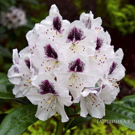 Рододендрон гибридный Кальсап - Высокий куст, во взрослом возрасте достигает 120 – 130 см в высоту и ширину. Крона широкая. Цветение густое и щедрое, наступает в конце мая. Листья плотные, покрыты лоском, насыщенного темно – зеленого цвета, среднего размера, до 7 – 8 см. Цветки молочно – белые, с темно – бардовыми пятнами – россыпями. Диаметр цветка 7-8 см. Сорт устойчив к морозам.