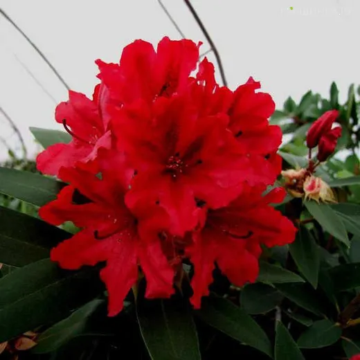 Рододендрон гибридный Таррагона - Диаметр кроны взрослого растения 2 м. Высота взрослого растения: 1,5 м. Вечнозеленый, рыхлый кустарник с вертикально направленными ветвями. Листья крупные (до16 см), эллиптические, темно-зеленые, блестящие, кожистые. Цветки крупные, красные с крапом на верхнем лепестке (до 6 см), без запаха, собраны в компактные соцветия по 10-12 штук. Цветет в начале июня.