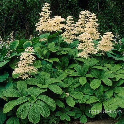 Роджерсия конскокаштанолистная - высота растения от 80 до 180 сантиметров. Листья крупные, по форме сходные с каштановыми, ярко-зелёные, с бронзовыми разводами весной и поздней осенью. Цветоносы высотой до 140 сантиметров, образуют густые метёлки с цветами белой или светло-розовой окраски.