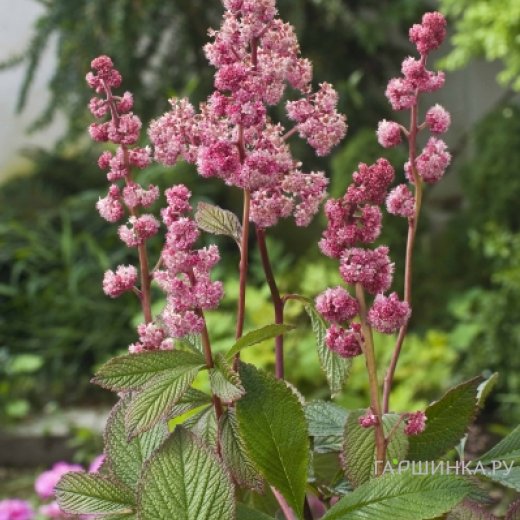 Роджерсия Дарк Покерс перистая - Цветки розовато-красные. Листья зелёные с пурпурно-коричневой каймой, осенью красновато-бронзовые. Цветоносы тёмные. Высота может достигать до 100 см.