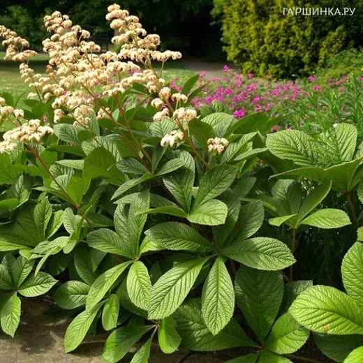 Роджерсия перистая очень эффектный декоративно-лиственный многолетник. Молодые листья При распускании они пурпурные, позже – темно-зеленые, с рельефным жилкованием. Цветки мелкие белые или розовые, собраны в соцветие - сложную метелку. Растение высотой до 50-60 см. Ширина куста: до 1 м. Листья перистораздельные, длиной 50 см, шириной 30 см на прочных крепких черешках длиной от 40 до 100 см. Цветки мелкие с приятным ароматом. высота цветоноса 100 - 120 см. Цветет в июле.
