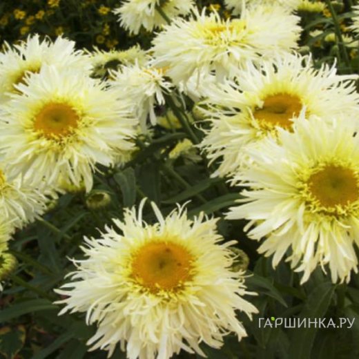 Ромашка (Нивяник) Голдрауш - Цветки этого многолетника имеют яркий центр желтого цвета, окаймлен пышными, махровыми лепестками. Ближе к центру они имеют лимонную окраску, крайний ряд — нежную кремовую. Высота растения от 45 и не более 60 см. Цветки крупные, до 10 см в диаметре. Цветет обильно и продолжительно, с июня по август. Взрослое растение имеет крепкие стебли. Зона зимостойкости: 4 (-35 ° С).