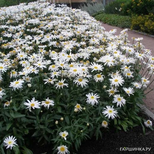 Нивяник (Ромашка) обыкновенный - хотя и является довольно обыкновенным растением, но она вызывает неподдельный интерес среди цветоводов. Ромашка настолько распространена в нашей стране, что ее можно найти в любом саду. Это травянистое корневищное растение относится к многолетним. Имеет небольшое, наземное укореняющееся корневище и множество больших ветвистых стеблей. Сами листья стеблевые, нижние – черешковые лопатчатые, верхние имеют продолговатую форму, сидячие, по бокам городчатые. Соцветия представляют собой плетенки поперечником около 10 см. Простые соцветия имеют белоснежные язычковые цветки, которые расположены по краю в 1-2 ряда, а трубчатые желтоватые находятся в центре. Цветет обильно и продолжительно начиная с июня. Высота растения от 40 до 50 см.