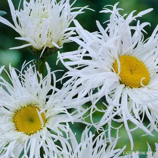 Ромашка (Нивяник) Олд Корт Вэраети - Цветки необычной формы, белые с массой очень узких завивающихся лепестков вокруг маленького жёлтого центра. В кусте очень много цветоносных стеблей. Высота:60-80 см. Цветки в диаметре 12 см. Цветет обильно и продолжительно, с июля по август. Зимостойкость: зона 4.