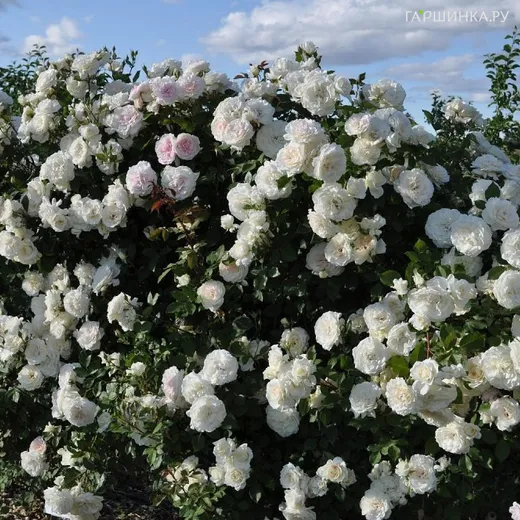 Роза Аляска плетистая, Топалович (лиц) - группа плетистых роз. Размер плети 2,0 м, направляются легко. Цветки белоснежные, с кремовым оттенком, 8 см, форма классическая, густомахровая, бокаловидная, цветение кистями и одиночное, повторно цветет, присутствует легкий аромат. Листва зеленая, крупная, глянцевая.