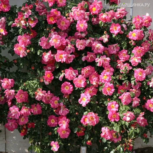 Роза Баяццо, Кордес (лиц) - относится к группе шрабы. Куст сильный, устойчивый, разветвленный вертикальный, 200-220 см. Цветок ярко-розовый, в центре желтый глазок, обратная сторона лепестка серебристая, 8 см, в соцветии, к дождю устойчив, форма классическая, полумахровая, розетковидная, аромат слабый, устойчивый. Лист средне - плотный, зеленый, полуглянцевый. Цветение обильное, повторное. Зона зимостойкости 6.