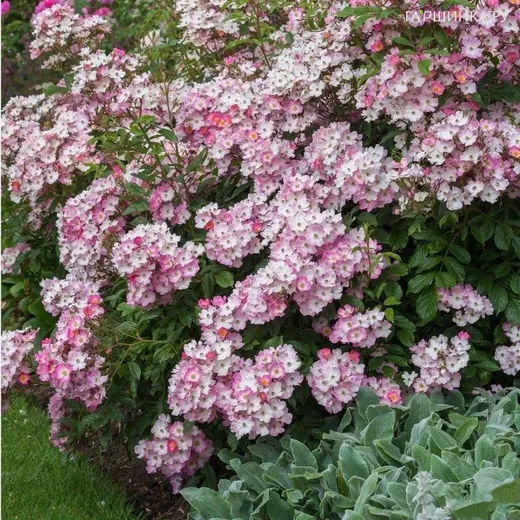 Роза Балерина, Гийо (лиц) - группа мускусных гибридов. Куст прямостоячий, высота 1,5 м., компактный. Цветение одиночное и в кистях, обильное и продолжительное, повторное. Цветок 3 см, немахровый, форма чашевидная, окраска нежно-розовая, присутствует аромат. Лист матовый, темно-зеленый.
