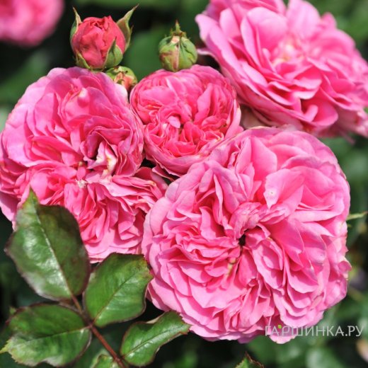 Роза Баронесса - Куст до 80 см в высоту. Листва темно-зеленая, глянцевая. Цветки ярко-розовые, до 8 см в диаметре, розетковидной формы. Густомахровые, собраны в пышные соцветия. Цветение обильное, без перерывов. Аромат средний. Высокая устойчивость заболеваниям. Почву предпочитает, легкую, влажную. Зона морозостойкости 6.