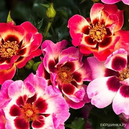 Роза Блашин Бэбилон Айз, Интерплант (Rose Blushing Babylon Eyes (Interplant)). Цветки до 6 см, двойные, простые. Цвет розовый с желтым ореолом вокруг темно-красного базального пятна. Запаха нет. Цветение повторное. Куст компактный, прямой, хорошо разветвлённый, высота до 50 см, ширина до 90 см. Устойчивость к заболеваниям высокая. Зона зимостойкости 6 (-23 С)