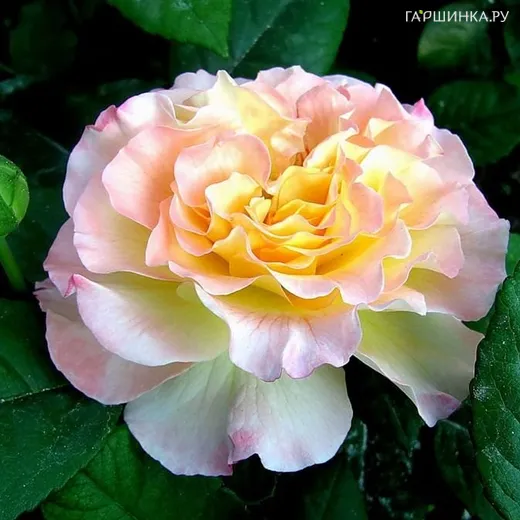Роза Акварель чайно-гибридная, Тантау (лиц) - бутон розово-кремовый, бокаловидный до шаровидного. Цветок кремовый с золотисто-персиковым центром и розово-малиновыми краями лепестков, шаровидный до чашевидного, с высоким центром, густомахровый (60-70 лепестков), обладает очень насыщенным сладким фруктовым ароматом. Лист темно-зеленый глянцевый плотный.