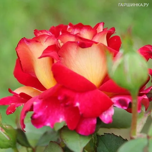 Роза Большой Театр чайно-гибридная, Топалович (лиц) - Аромат, красота и необычная комбинация цветов – все это присутствует в этой великолепной современной розе. Цветки почти всегда одиночные, на длинных, сильных стеблях, алого и желтого цветов, когда только раскроются: верхняя сторона лепестков алая, а оборотная сторона чисто-желтая. Когда цветок полностью раскрывается, желтые тона уходят, и цветок становится ярко-красным с одной стороны, и розовым с другой. Затем лепестки начинают кудрявиться, что снова подчеркивает контраст цветов. Цветок хорош на всех стадиях своего развития, что делает розу ценным приобретением как для сада, так и в качестве срезки.