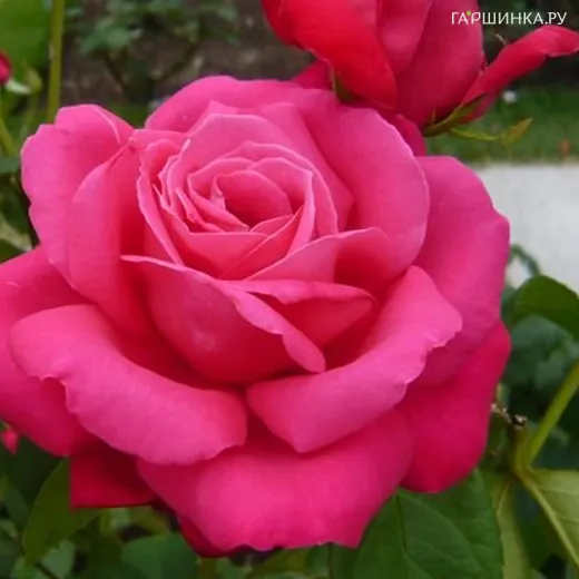 Роза Мария Каллас чайно-гибридная, Топалович (лиц) - Крупные цветки насыщенно-розового цвета из 50-60 лепестков, с сильным ароматом, классической формы чайно-гибридной розы с высоким центром, на побегах в основном одиночные. Куст вертикальный, с прочными побегами и ярко-зеленой, матовой листвой.