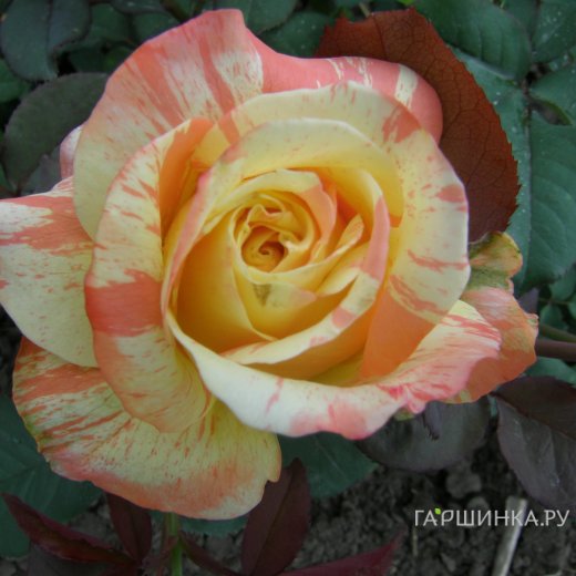 Роза Марвел чайно-гибридная, Imperial Rose - Цветки темно-желтые, с красными и оранжевыми полосками, крупные, махровые. Молодая листва бронзовая, позднее становится ярко-зеленой, блестящая. Цветки появляются по одному на длинных побегах, они ярко-желтые с оранжевыми полосками и потеками. Полоски лучше видны на внешней стороне лепестков - изнанка остается чисто-желтой. Позднее желтый цвет выгорает до кремового, а оранжевый становится малиновым, но цветок остается очень хорош. Куст мощный, прямостоячий, с крупными шипами, темной листвой. Молодой прирост малиновый.