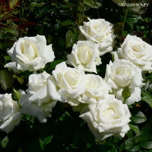 Роза Метрополитен чайно-гибридная, Топалович (лиц) - Цветки белые, махровые, 28 - 40 лепестков, классической формы с высоким центром, на побегах в основном одиночные, с насыщенным ароматом фруктов с нотками банана, абрикоса, персика и лилии. Куст вертикальный, высокий, густооблиственный, листва темно-зеленая, полу-глянцевая.