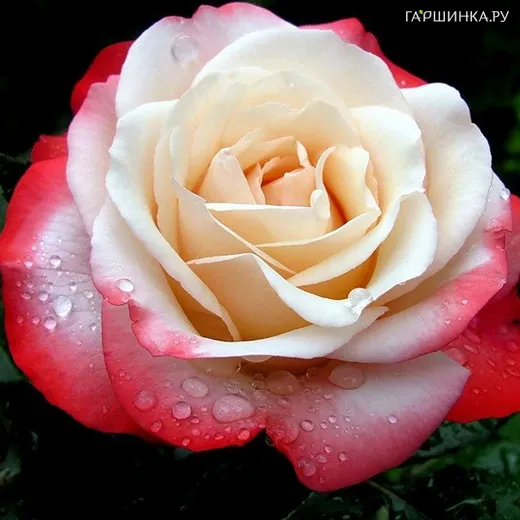 Роза Ностальжи чайно-гибридная, Тантау (лиц) - Бутон белый с красной каймой, крупный, шаровидный. Цветок нежный кремово-белый в центре с ярким вишнево-красным, слегка волнистым краем, чашевидный, долго сохраняет форму и цвет, махровый (35 - 45 лепестков), обладает насыщенным сладким ароматом. Лист средний, черно-зеленый, сильноглянцевый, молодой с антоциановой окраской (темно-красный). Растение компактное, с прочными прямостоячими побегами. Цветение обильное, почти непрерывное.