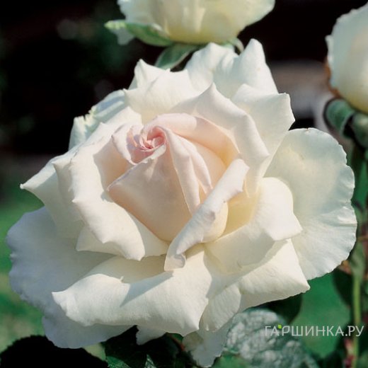 Роза Покер чайно-гибридная, Топалович (лиц) - Цветки классические, элегантные, с сильным ароматом. В центре распускающегося бутона присутствует розовый оттенок, но цветки быстро выгорают до белых. Появляются по одному на длинных сильных побегах, великолепны в срезке. Листва средних размеров, темно-зеленая, куст жесткий, прямостоячий.