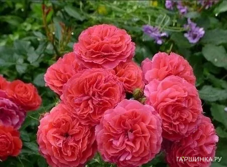 Роза Черри Герл, Кордес (лиц) Вишнево-красные, густомахровые (до 60-70 лепестков), чашевидные цветки старинной формы появляются в небольших кистях из темно-красных, округлых бутонов. Аромат легкий. Куст компактный, вертикальный, плотный, с темно-зеленой, сильно глянцевой листвой.