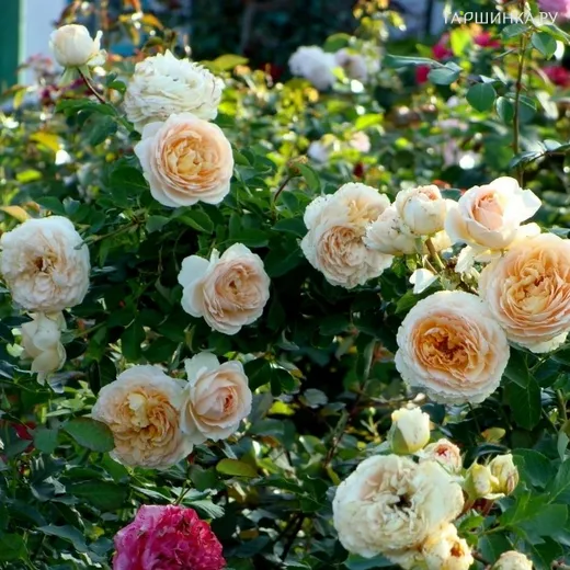 Роза Дени Хан - цветки крупные, около 12 см в диаметре, белые,с абрикосовым центром. Аромат средний, с тонами абрикоса, сирени и перца. Цветки густомахровые, растут в небольших кистях, квартированные. Цветение обильное. Листва крупная, блестящая, густая.